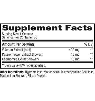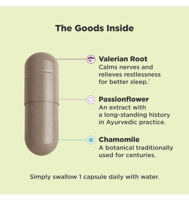 - RAÍZ VALLERIANA: Tradicionalmente utilizada para calmar los nervios y aliviar la inquietud, esta raíz relajante ayuda a mejorar la calidad del sueño. Más bienes en el interior: Pasiflor, utilizado tradicionalmente en la medicina herbal para ayudar a inducir el sueño y manzanilla para calmar la mente. *
