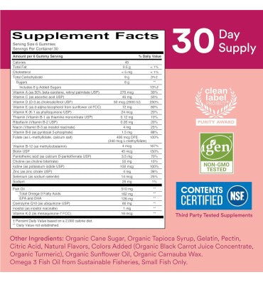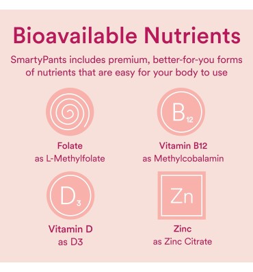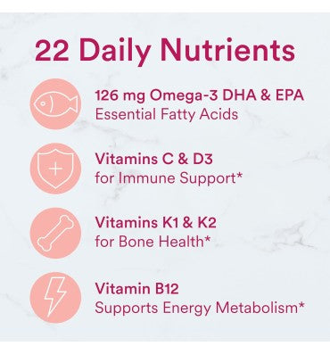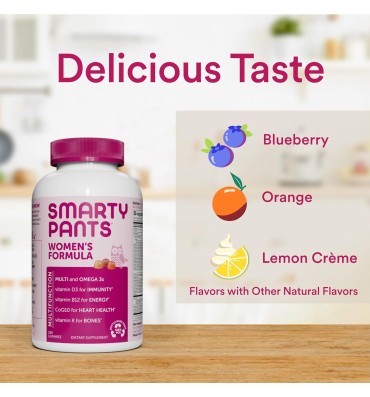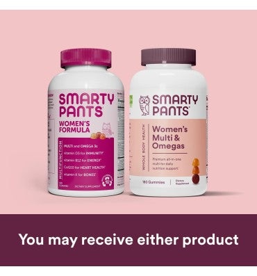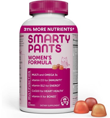 SmartyPants Women's Multi & Omegas gummies are made with over 15 premium nutrients including omega-3 EPA and DHA essential fatty acids, vitamin D3 for immune health, vitamin B12 to support energy metabolism, CoQ10 for heart health, vitamins K for bone health and SmartyPants Women’s Multi & Omegas is non-GMO, gluten-free and free of artificial colors or sweeteners.SmartyPants are third-party lab tested for purity and potency, so you know what you read on the label is what you get in the bottle. And we're proud to say our partnership with Vitamin Angels provides life-changing nutrients to women and children in the U.S. and globally.