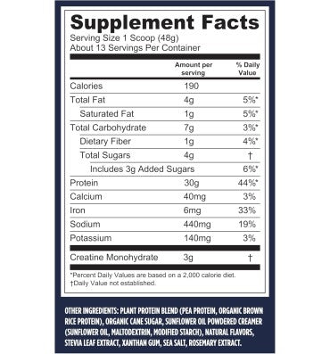 Potencia tu transformación y maximiza tus entrenamientos con 30 g de proteína de origen vegetal y 3 g de monohidrato de creatina.
