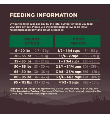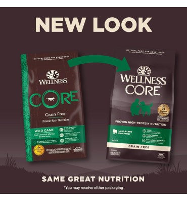 Wellness CORE Natural Grain Free Dry Dog Food Lamb Recipe is healthy, 100% natural grain free dog food for adult dogs made with premium protein and fruits and vegetables to help support your dog's optimal health and fortified with antioxidents, probiotics, vitamins and minerals, including fish and flax omega blend for healthy skin and coat. Wellness CORE grain free dog food formulas are based on the nutritional philosophy that dogs thrive on a diet mainly comprised of meat.