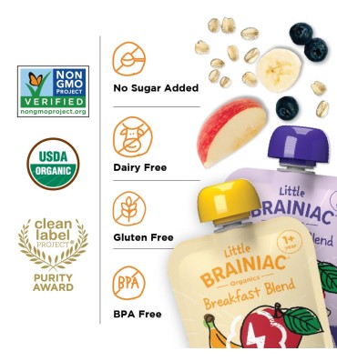 - Clean Label Project Purity Award Winner: Little Brainiac toddler pouches received the Clean Label Purity Certification verifying rigorous ingredient testing making it a safe snack for the entire family