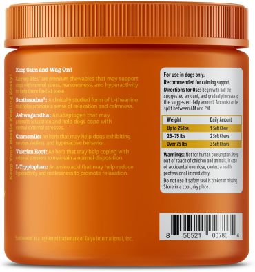 - Con Suntheanine - Cada masticable contiene Suntheanine, una forma clínicamente estudiada y súper premium de L-teanina que ayuda a promover una sensación de relajación y calma para tu cachorro.