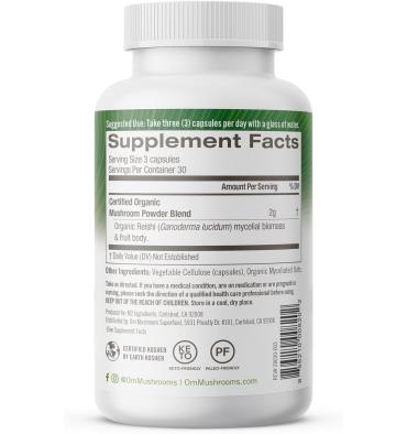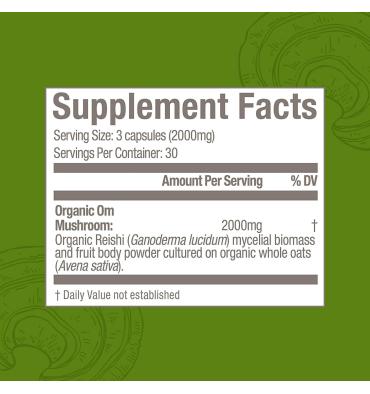 • Om Mushroom Superfood Reishi Polvo de hongos orgánicos: Contiene 90 cápsulas que contienen polvo de hongos integrales, cuerpo de fruta de Reishi (Ganoderma lucidum) orgánico certificado y polvo de biomasa micelial cultivada en avena orgánica.