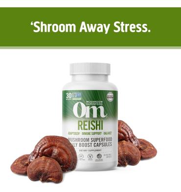 Om Mushroom Superfood Reishi Mushroom Capsules Suplemento superalimentario, 90 unidades, 30 días, adaptógeno, estrés y apoyo inmunológico, suplemento de hongos superalimentos