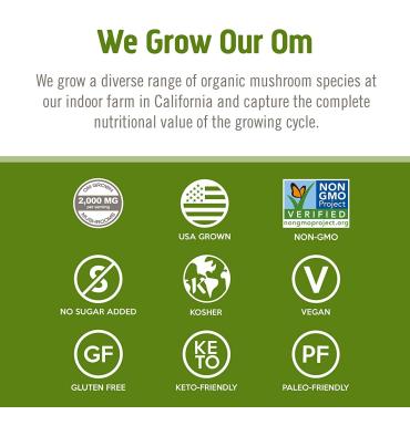 • Cultivado en los EE. UU. al estilo Om: Los superalimentos en polvo, las cápsulas, las bebidas calientes, las bebidas energéticas y los caldos de hongos Om se producen en los EE. UU. Cultivamos, secamos y trituramos nuestros hongos orgánicos hasta convertirlos en polvo en nuestras instalaciones de última generación en el sur de California, para garantizar la más alta calidad, y verificamos mediante pruebas de terceros. Las cápsulas de Om Mushroom no contienen OGM, no contienen gluten, son veganas, se cultivan en los EE. UU., son aptas para paleo, cetogénicas y kosher.