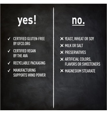 - Fabricado de forma responsable: certificado sin gluten, vegano y verificado sin OMG, fabricado con embalaje reciclable, la fabricación de este producto soporta la energía eólica. Este producto no contiene levadura, maíz, trigo, soja, leche, conservantes o colorantes, sabores o edulcorantes artificiales.