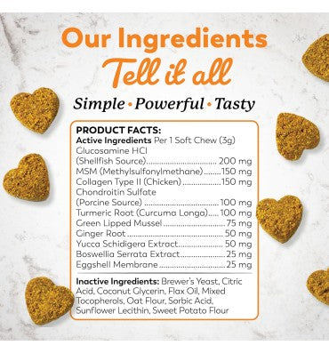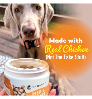 - Chicken Flavor-These chicken-flavored soft chews are a tasty and natural way to support your dog's joint health. Dogs love the taste and texture of these soft chewables, which makes it easy to give dogs their daily dose of joint support. Whether you have an older dog with joint issues or want to support your young, active dog's joint health, Dr. Harvey's Hip and Joint Soft Chews are suitable for dogs of all ages and sizes. With 90 soft chews per jar, one jar will last for months.