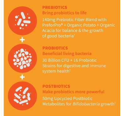 - Todo el Shebang: los probióticos acaban de actualizar; Conoce los 30 mil millones de integrales, una fórmula de triple acción con prebióticos clínicamente probados, probióticos clínicamente estudiados y específicos para afecciones además de postbióticos reciclados, dice que tres veces rápido