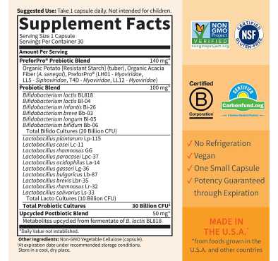 - Formulado por expertos: nuestra línea de Triple Action Pre, Pro y Postbióticos es orgullosamente sin OMG, sin gluten y neutro en carbono, y con nuestros postbióticos, metabolitos reciclados que apoyan el crecimiento de bividobacterias, estamos haciendo nuestra parte para ayudar a reducir los residuos