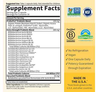 - Fabricado pensando en la comodidad: No hay nada como saber que tomas uno y ya está. Nuestro probiótico completo y extra fuerte de 100 mil millones, uno al día, para mujeres y hombres viene en una cápsula vegetariana y por completo estable con la que puedes contar