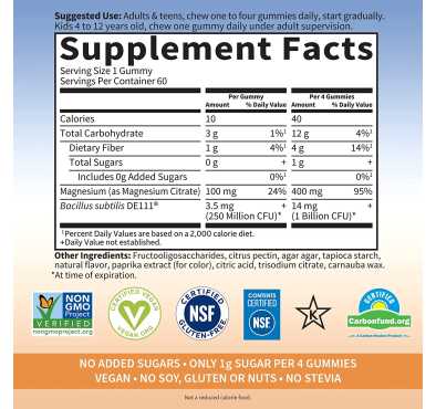 - Apoyo digestivo que toda la familia amará: cuatro de nuestras gomitas con sabor a frambuesa ofrecen prebióticos y 1 mil millones de CFU de probióticos clínicamente estudiados para apoyo digestivo, con solo 0.04 oz de azúcar de fruta (sin azúcares añadidos ni estevia)
