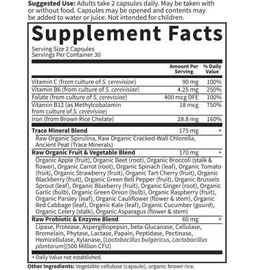 Vitamin Code Healthy Blood proporciona los componentes básicos esenciales para apoyar la salud de la sangre. Vitamin Code Healthy Blood ofrece 28 mg de hierro suave y no ligante, así como vitaminas B y C para promover la absorción de hierro. RAW significa sin calor, aglutinantes o rellenos sintéticos, sabores artificiales, edulcorantes, colorantes o aditivos comúnmente utilizados en tabletas. Esta formula se mezcla en una base de 23 frutas y verduras más 75 minerales traza alcalinizantes para agregar antioxidantes, vitaminas y cofactores de nutrientes.