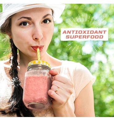 • Jugo rojo en polvo de bayas de Goji formulado para proporcionar energía, ayudar en la digestión y promover la circulación. ¡Una alternativa saludable a las bebidas azucaradas con sabor artificial!