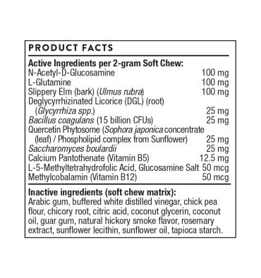 El olmo resbaladizo botánico, que tiene propiedades emolientes y emolientes, brinda protección calmante para las membranas mucosas del tracto intestinal, y el regaliz desglicirricinado apoya un revestimiento intestinal saludable al aumentar el flujo sanguíneo y mantener la relajación muscular normal.