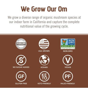 Cultivado en Estados Unidos: los polvos de superalimentos Om Mushroom Superfood en polvo, cápsulas, bebidas calientes, bebidas energéticas y caldos se producen en los Estados Unidos. Cultivamos, secamos y molemos nuestros hongos orgánicos en polvos en nuestras instalaciones de última generación en el sur de California, para garantizar la más alta calidad y verificar utilizando pruebas de terceros. Las cápsulas Om Mushroom no son OMG, sin gluten, veganas, cultivadas en los Estados Unidos, aptas para paleo, kosher