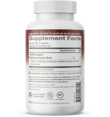 Om Mushroom Superfood Cordyceps - Polvo de hongos orgánicos: contiene 90 cápsulas (suministro de 30 días) de cuerpo de fruta de cordyceps militaris orgánico 100% certificado y polvo de biomasa miccelial cultivado en avena orgánica para energía, resistencia y energía