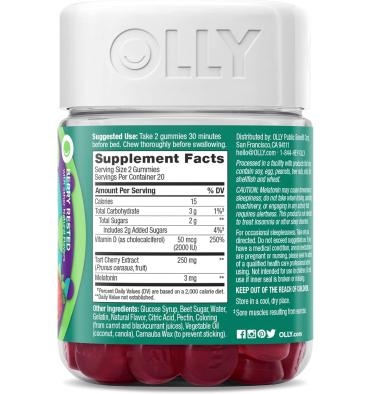 OLLY Gomitas de sueño para Recuperación Muscular, soporte muscular para sueño y dolor, 3 mg de melatonina, cereza ácida, vitamina D, sabor a baya, 40 unidades