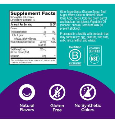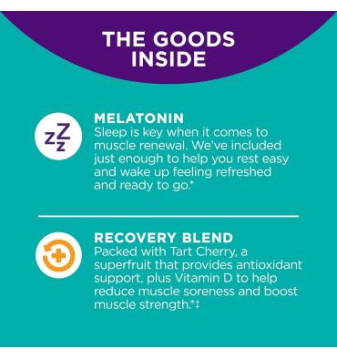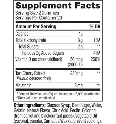 Los productos en el interior: 3 mg de melatonina te ayuda a descansar tranquilo y despertar sintiéndote renovado. Tart Cherry proporciona apoyo antioxidante para ayudar con la recuperación muscular después de la actividad física, y la vitamina D ayuda a aliviar los músculos doloridos del ejercicio diario*