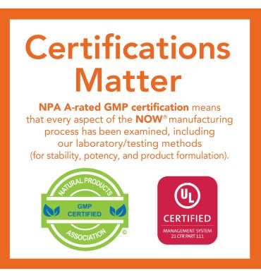 - Calidad garantizada por GMP: la certificación GMP con clasificación A de NPA significa que se han examinado todos los aspectos del proceso de fabricación de NOW incluyendo nuestros métodos de laboratorio/prueba (para estabilidad, potencia y formulación del producto).