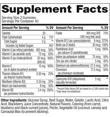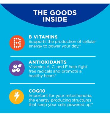 - Los productos en el interior: Las vitaminas diarias masticables están repletas de los nutrientes que tu cuerpo necesita. Las vitaminas B y CoQ10 apoyan la producción de energía para alimentar tu día. Los antioxidantes como las vitaminas A, C y E ayudan a combatir los radicales libres y promover un corazón saludable
