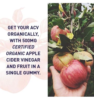 - Alimento entero: 500 mg de vinagre de sidra de manzana sin refinar y fruta orgánica real, además de vitamina B12 como metilcobalamina, todo hecho de alimentos enteros y entregado en una sabrosa goma orgánica con sabores y colores naturales, como zanahoria y grosella negra