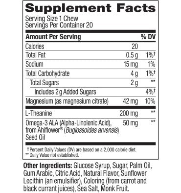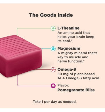 - CHILL BRAINY CHEWS: Nuestros masticables de L-teanina, con magnesio y Omega-3 ALA, trabajan con su cuerpo para ayudar a mantener una mente tranquila y un rendimiento cognitivo.*
