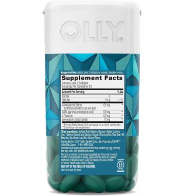 - OLLY Gel ultra suave de adiós al estrés: las cápsulas blandas Goodbye Stress Ultra se mezclan con potentes botánicos y nutrientes para ayudarte a mantenerte tranquilo y centrado