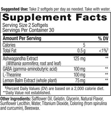 - Los productos en el interior: las cápsulas blandas OLLY Goodbye Stress se mezclan por expertos con GABA, un activo de trabajo rápido (en 30-60 minutos) que apoya un estado de ánimo relajado. L-Theanine es el socio de GABA en sublime: va directamente a trabajar en tu cerebro para ayudarte a mantenerte fresco, y el bálsamo de limón es un botánico relajante que se ha utilizado durante siglos para ayudar a calmar la mente. Además, Ashwagandha para el estado de ánimo y el apoyo energético