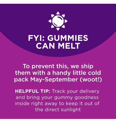 • Se envía con un paquete frío: las gomitas pueden derretirse en el calor; para evitar esto, las enviamos con un práctico paquete frío de mayo a septiembre (woot! ); rastrea tu entrega para que no se quede fuera durante demasiado tiempo y mantenla fuera de la luz solar directa