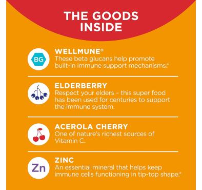 * LOS PRODUCTOS DEL INTERIOR: Una poderosa mezcla con Wellmune Beta Glucans, un ingrediente respaldado científicamente para mantener las células de defensa inmune en óptimas condiciones. Cereza de acerola, una rica fuente natural de vitamina C. Además de saúco y zinc para apoyo inmunológico.
