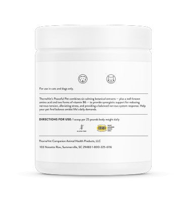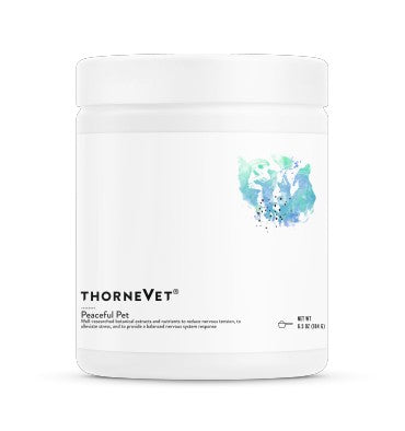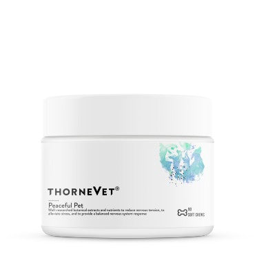 Peaceful Pet de ThorneVet combina seis extractos botánicos bien investigados, además de un conocido aminoácido y dos formas bioactivas de vitamina B6, que brindan apoyo sinérgico para reducir la tensión nerviosa, aliviar el estrés y brindar respuestas equilibradas en todo el sistema nervioso.