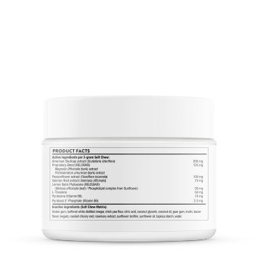 Contiene RELORA®, una mezcla patentada de dos extractos botánicos, de las cortezas del árbol de magnolia y del árbol de fellodendro, que se ha demostrado que reducen el estrés, moderan la ansiedad y mejoran el estado de ánimo.