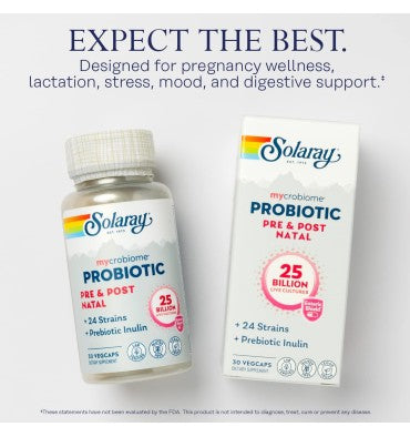 - El probiótico para futuras mamás y nuevas mamás: los probióticos pre y post natales de Solaray Mycrobiome para mujeres están formulados para suministrar 25 mil millones de UFC de 24 cepas probióticas clínicamente investigadas.