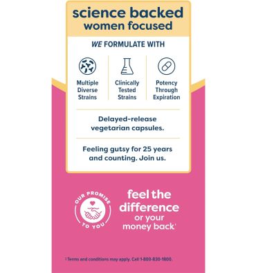 - Probado y formulado: incluye 3.5 mil millones de cultivos de cepas probióticas centradas en mujeres que son clínicamente probados y formulados por microbiólogos e investigadores