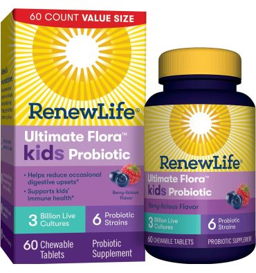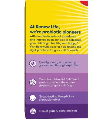 Renew Life Probióticos para Niños, apoyan la salud digestiva e inmunológica, sin gluten, lácteos y soya, sabor a berries, 60 tabletas masticables.