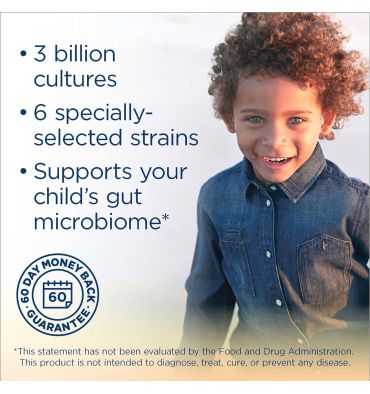 - Probiótico para niños de 2 años en adelante: fabricado con 3 mil millones de cultivos y 6 cepas especialmente seleccionadas para ayudar a reducir molestias digestivas ocasionales y apoyar el equilibrio digestivo* (el paquete puede variar)