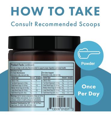 - Cada cucharada proporciona a tu mascota 38 mil millones de bacterias amigables con el intestino de 14 cepas cuidadosamente seleccionadas conocidas por promover la flora intestinal beneficiosa y una salud gastrointestinal óptima
