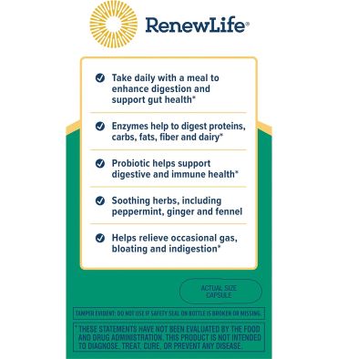 - Enzimas digestivas de acción rápida: las potentes enzimas digestivas de Renew Life Digestive Duo Probiotic + Enzimas son de acción rápida y ayudan a digerir proteínas, carbohidratos, grasas, fibra y lácteos* (el paquete puede variar)