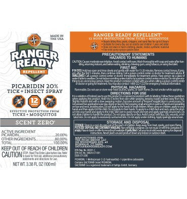 Ranger Ready con Picaridina al 20% Repelente de Moscos, Insectos y Garrapatas, sin aroma. 100 ml.
