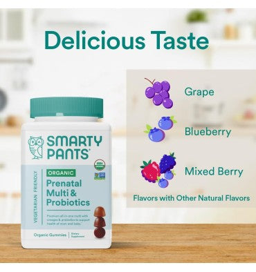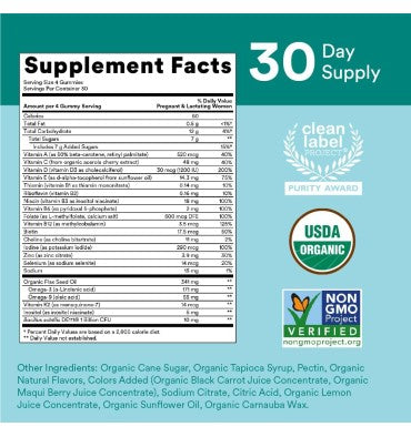 SmartyPants Organic Prenatal Multi & Omegas gummies are specifically formulated with over 13 premium nutrients including vegetarian omega-3 ALA from organic flaxseed oil, folate as methylfolate to support normal early fetal development, vitamin D3 for immune health and vitamin B12 to support energy metabolism. Your all-in-one multifunctional supplement for nutrient support prior to, during and post-pregnancy. SmartyPants are third-party lab tested for purity and potency, so you know what you read on the label is what you get in the bottle. We're proud to say our partnership with Vitamin Angels provides life-changing nutrients to women and children in the U.S. and globally.