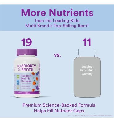 Premium Toddler Gummy Formula: SmartyPants Toddler Multi & Omegas contains more nutrients than the leading kid’s multivitamin brand’s top-selling item and is specifically formulated to help fill nutritional gaps toddlers may have (Based on $ Sales, IRI InfoScan, and MULO, 05/2022-05/2023)