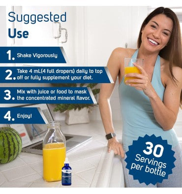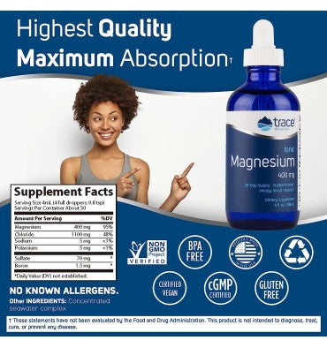 - Magnesio iónico líquido: 400 mg de magnesio líquido es una fuente rica, natural y concentrada de cloruro de magnesio con un espectro completo de oligoelementos iónicos que actúan como cofactores naturales