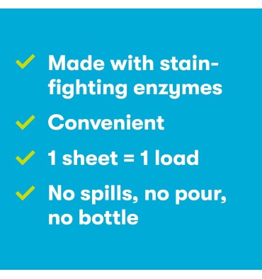 - 1 sábana de lavandería = 1 carga de detergente: simplemente métela y mira cómo se disuelve instantáneamente tanto en agua fría como caliente, combatiendo la suciedad y las manchas difíciles mientras deja tu ropa limpia, fresca y libre de residuos.