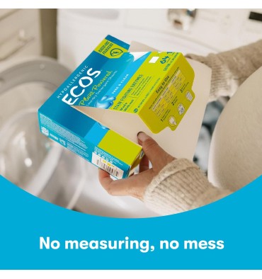 - Sin medir, sin ensuciar: evita el desorden, el espacio y la medición con ECOS. Use 1 hoja para una carga completa o media para una carga más pequeña. Sin medición y nada que derramar.