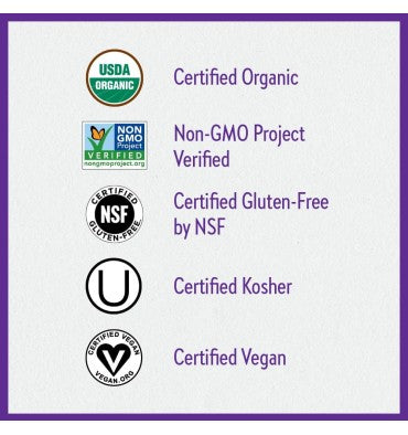 - Certificado orgánico USDA, proyecto verificado sin OMG, certificado sin gluten por NSF, certificado Kosher, 100% vegetariano, sin sabores ni colores artificiales, cumple con la FDA y GMP, probado por terceros