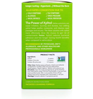 - LA REVOLUCIÓN DEL XILITOL: La revolucionaria fórmula de solución salina patentada de Xlear agrega 0.14 oz de xilitol junto con 0.07 oz de solución salina. A diferencia del enjuague nasal típico, este es un tratamiento proactivo superior y duradero que aborda la causa raíz de la congestión y la infección en lugar de simplemente aliviar los síntomas a corto plazo. Nuestro enjuague natural para senos nasales funciona muy bien con cualquier sistema de riego nasal o como reemplazo de paquetes de sal neti pot como limpiador diario de nariz.